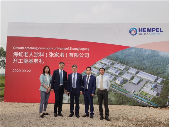 On September 22, invited by the Owner, the delegation led by Haisum's CPC Committee Secretary and Company Chairman Zhao Guoang and Haisum's CPC Committee Deputy Secretary Bian Junyi visited the site of Zhangjiagang Project and attended the Foundation-laying Ceremony of New EPCM Project of Hempel Paint (Zhangjiagang) Co., Ltd. with features an annual production of 180,000t high-performance paint and 20,000t water-based paint undertaken by the Fifth Design/Engineering Department of the headquarters of the Company. Zheng Wen, the Deputy General Manager of Fifth Design/Engineering Department and personnel in charge of the project team participated in the ceremony.