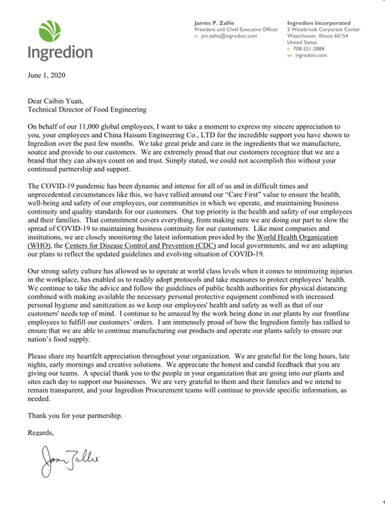 日前,海诚股份食品总监袁蔡斌收到一封来自美国宜瑞安集团(Inredion Incorporated)首席执行官詹姆斯•扎利(James Zallie)先生的感谢信,信中对公司的宜瑞安五星项目设计团队以及项目经理黄萍,在新冠疫情期间为项目顺利进行所付出的辛勤工作表示感谢。