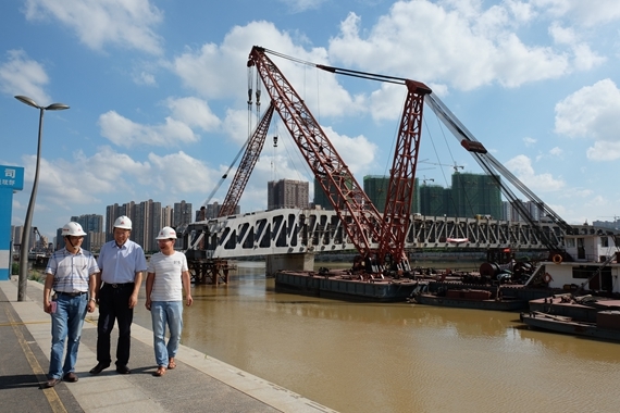 同一时间,浏阳河人行景观桥项目部已经完成了最后一艘浮吊平台的锚固工作。最初临时桥墩施工方案为每组8根钢管桩,监理部审核认为该方案未考虑最不利的极端天气下洪峰的影响,严令改正。最终方案改为14根钢管桩并予以实施。正是监理人富于远见的及时调整,在两日后浏阳河水位达40.00米的洪峰里,建设中的大桥巍然屹立,风雨不动!