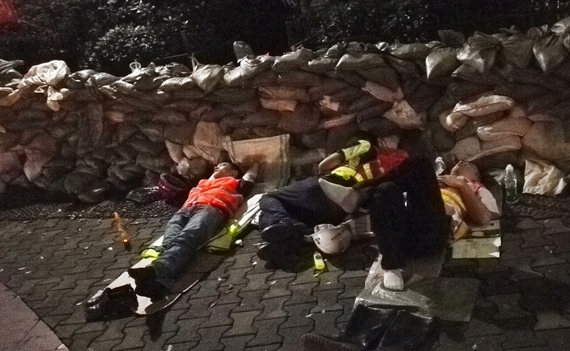 类似的场景也发生在湘府路河西高架桥项目部,该项目部刚刚进场,尚未正式动工。接到湘江新区管委会关于靳江河告急的抢险通知后,也立即全员出动积极投入抗洪战斗,保卫家园。