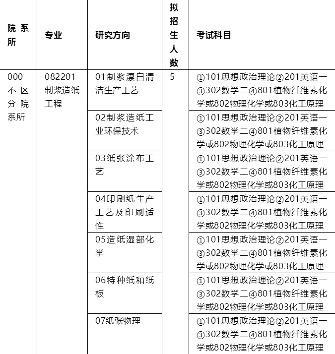 (三)全国统考初试科目为思想政治理论、英语(一)、数学(二)、植物纤维素化学或物理化学或化工原理,其中思想政治理论、英语(一)、数学(二)由教育部统一命题,植物纤维素化学、物理化学、化工原理由我院组织命题。