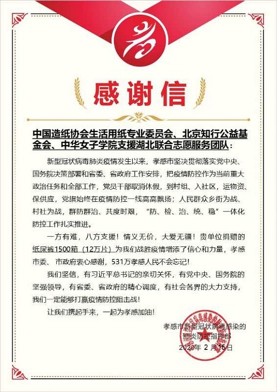 在新冠病毒肺炎疫情防控工作进入吃劲阶段之际,2月11日,中轻集团造纸院积极发挥行业号召力,通过设立在造纸院的中国造纸协会生活用纸专业委员会秘书处发起“加油武汉”爱心募捐倡议活动,在两天内募集捐款169万余元,并已完成成人纸尿裤等物资采购,送达至湖北地区相关医院,驰援一线医务人员。