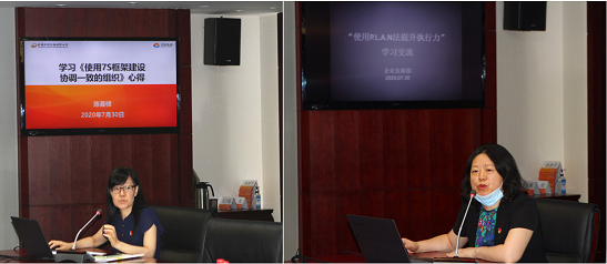 办公室主任陈荟棂围绕徐念沙书记党课和《使用7S框架建设协调一致的组织》课程内容,结合中轻集团宣传册制订工作分享学习心得;总经理助理、企业发展部主任肖丹围绕徐念沙书记党课和《使用PLAN法提升执行力》课程内容,结合中轻集团战略规划编制工作与大家进行充分交流。