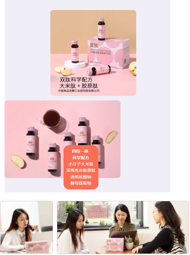 “皙肽”系列产品由保利中轻所属中国食品研究院自主研发生产,大米胶原复合肽果汁饮料以大米肽和自有专利提取的深海鱼皮胶原肽为核心原料,双肽科学配方,解决肌肤暗沉、干燥粗糙、弹性降低等肌肤问题,经过专业检测认证,安全放心;中国食品研究院专家团队匠心研发,经过长期追踪试饮反馈,肌肤问题明显改善。