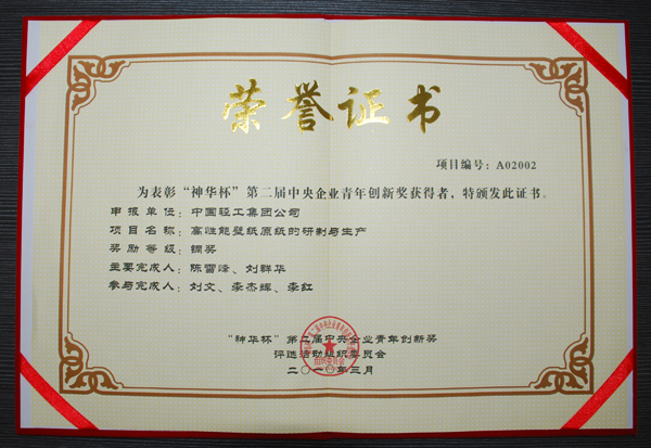 3月30日,“神华杯”第二届中央企业青年创新奖表彰大会在京举行,国资委主任李荣融发表重要讲话。中国轻工集团公司“高性能壁纸原纸的研制与生产”项目荣获“神华杯”第二届中央企业青年创新奖铜奖,该项目由中国制浆造纸研究院研究开发部特种纸技术研发中心完成。
